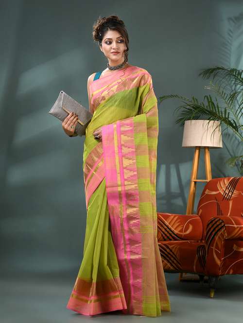 Elevate your ethnic style with this traditional Tant cotton saree, crafted using fine handloom saree techniques. Made from a soft cotton blend, it features elegant floral batik print and a subtle tissue silk saree-inspired pallu. Lightweight and breathable, it's perfect for daily wear or festive occasions.