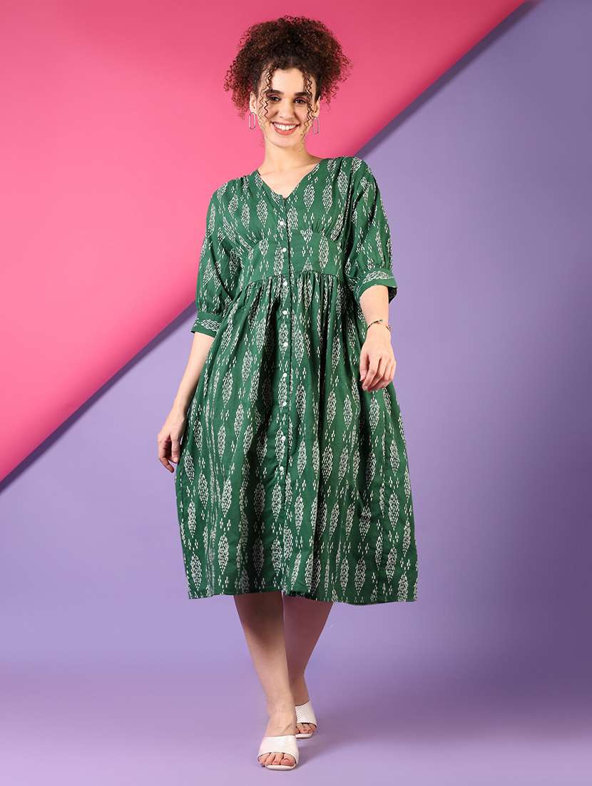 - » women green printed fit & flare ethnic dress