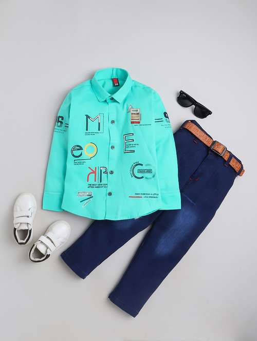 - » kids green typographic printed shirt & jeans set