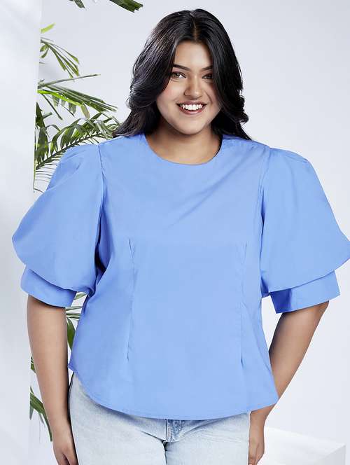 A chic workwear essential, this green cotton top features a round neck and stylish puff sleeves. The back button closure adds a refined touch, while the solid woven fabric ensures all-day comfort. With its structured yet feminine silhouette, it pairs beautifully with tailored trousers. Ideal for formal and semi-formal settings.