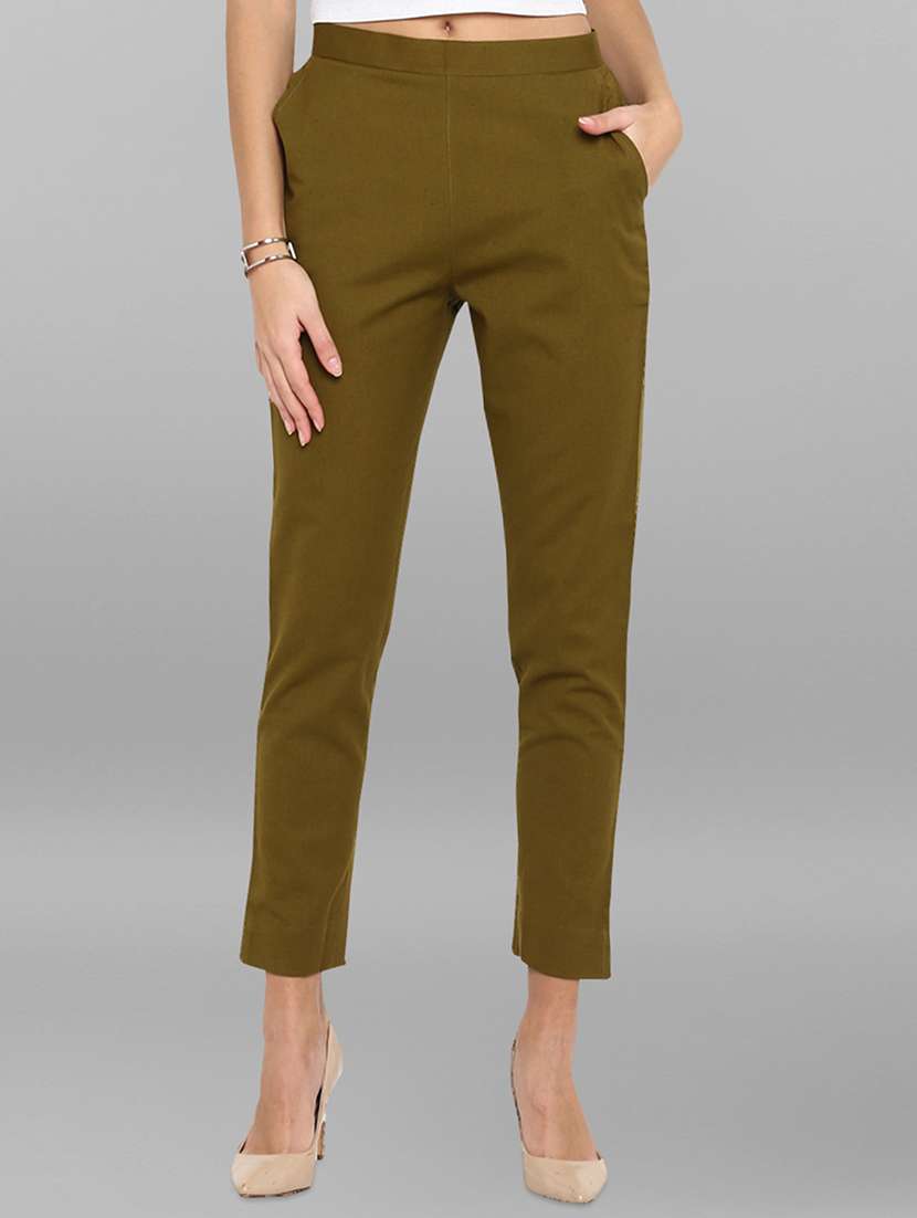 Janasya Women's Green Plain Cotton Pant With Partially Elasticed