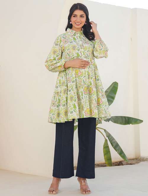 This green pure cotton floral-printed a-line maternity tunic is a blend of comfort and charm. Adorned with multicolored floral prints, it features a shirt collar and a front button closure for a feeding-friendly design. The gathers under the bust, combined with its tiered silhouette, provide a belly-friendly fit that grows with you throughout your pregnancy. Perfect for every mum-to-be, both during and after, this tunic pairs effortlessly with your favourite bottoms for a stylish yet practical look.
