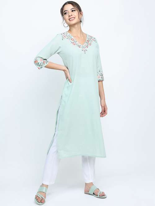 • Grab this beautiful kurta made up of cotton fabric featuring v neck neck designs.