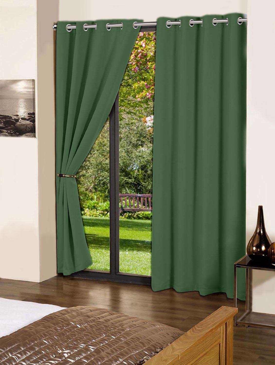 lushomes vineyard green plain cotton curtains with 8 eyelets & plain tiebacks for long door