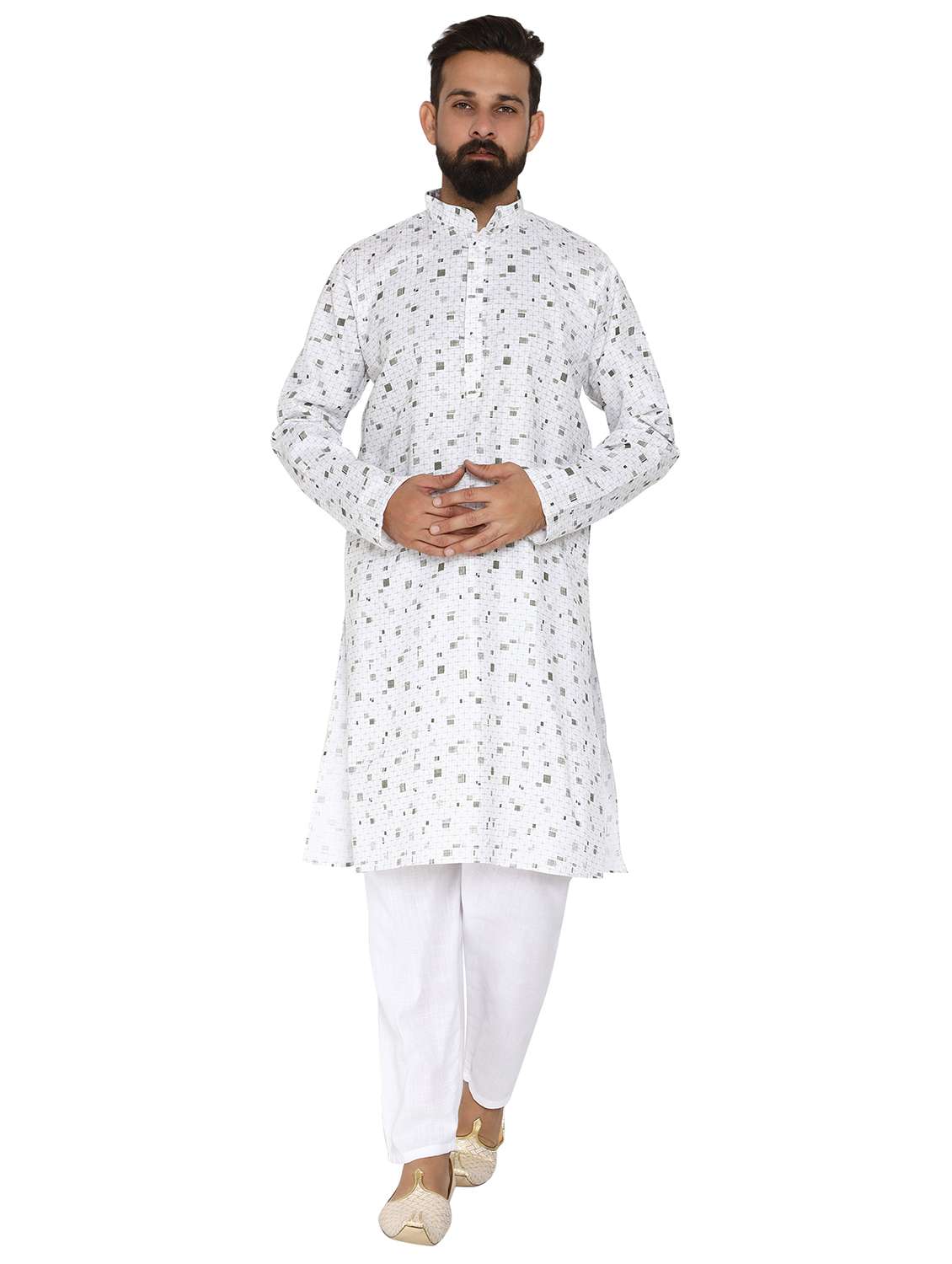 white printed long kurta pyjama ethic wear set
