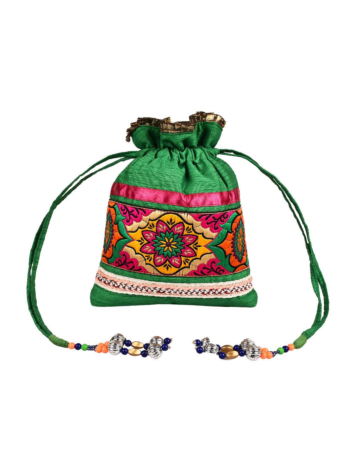 Add to your wardrobe, this beautiful potli from Anekaant. Great for your next family function or your friend's wedding. Carry it with your ethnic outfit and keep your valuables safe. Crafted with artsilk and decorative lace. Has drawstring closure. Wrist strap.