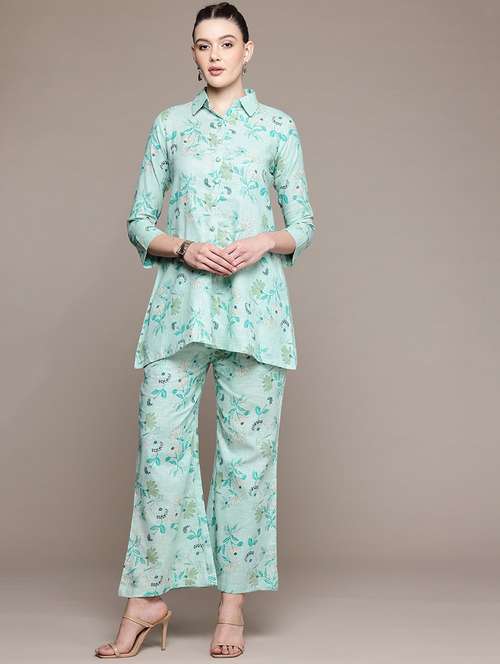 Women A line style Cotton fabric Green color Floral Printed Top and Bottom