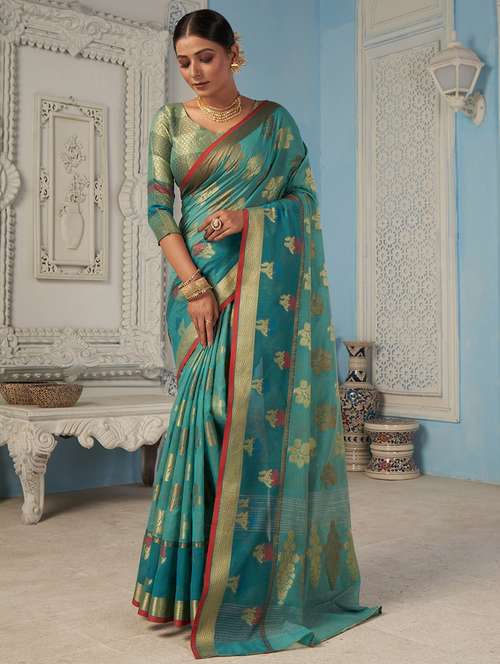 women's self design turquoise colored saree with blouse