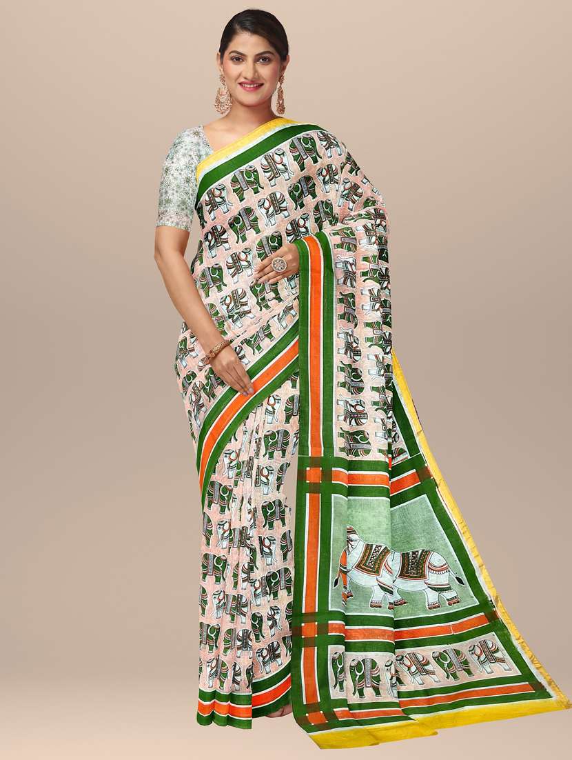 With the right material and drape, it can accentuate the beauty of women of all ages and forms. Be it a festival or a wedding, sarees are a hot favorite worldwide due to its popularity. Sarees give you the opportunity to provide a modern touch to a traditional Indian attire. Feel special in Orange Animal Print Cotton Handloom Saree.