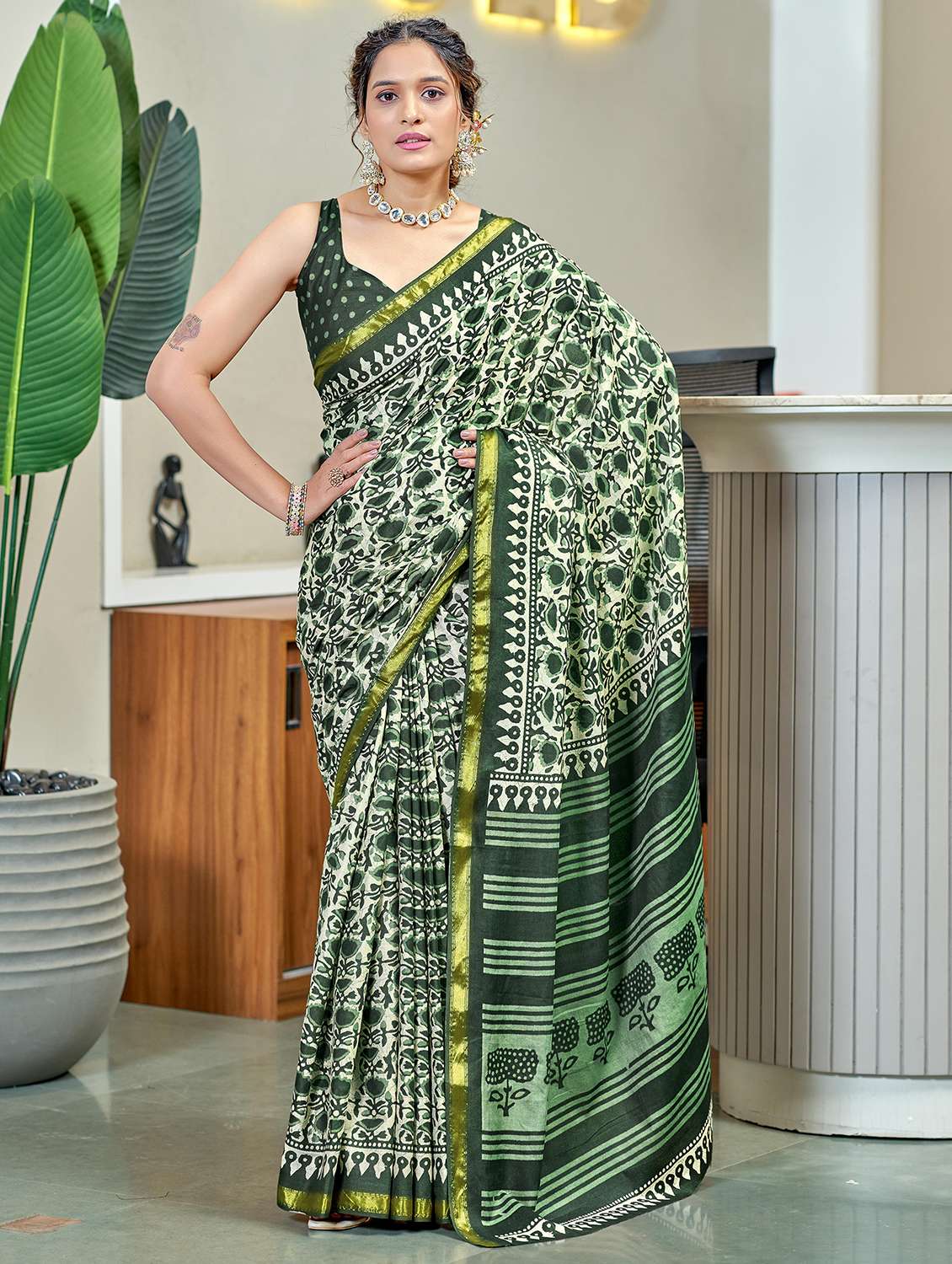 women green printed saree with blouse