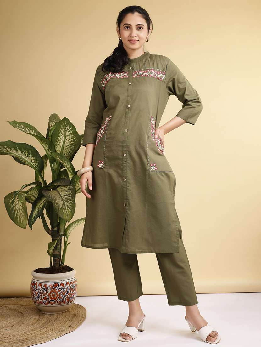 - Find gorgeous sets of ethnic wears in trending designs in olive colors suitable for casual wear of occasions.