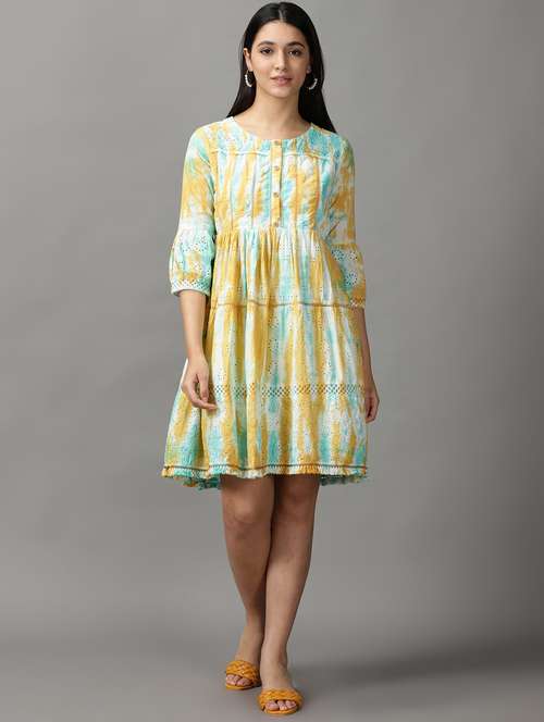 - Dress up in a soothing pattern and don this dress made of cotton material.