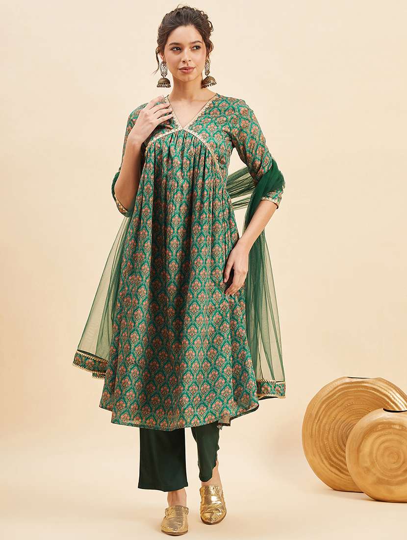- Find gorgeous sets of ethnic wears in trending designs in green colors suitable for festive wear of occasions.