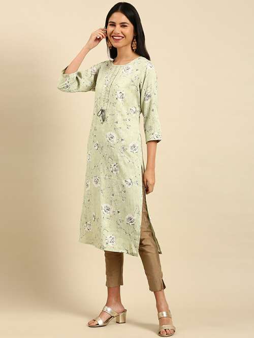- Grab this beautiful kurta made up of cotton silk fabric featuring round neck designs.