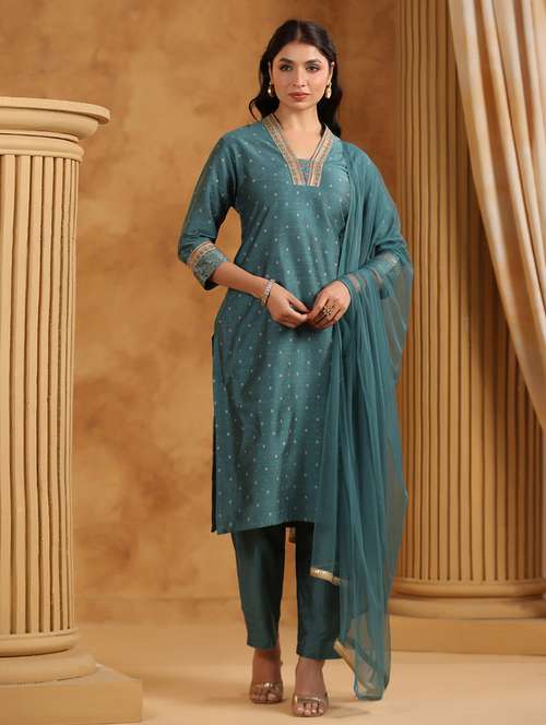 - Find gorgeous sets of ethnic wears in trending designs in teal colors suitable for festive wear of occasions.