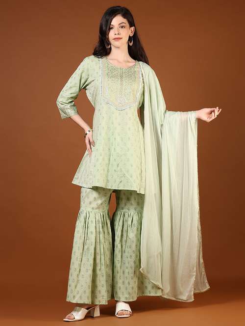 - Find gorgeous sets of ethnic wears in trending designs in green colors suitable for festive wear of occasions.