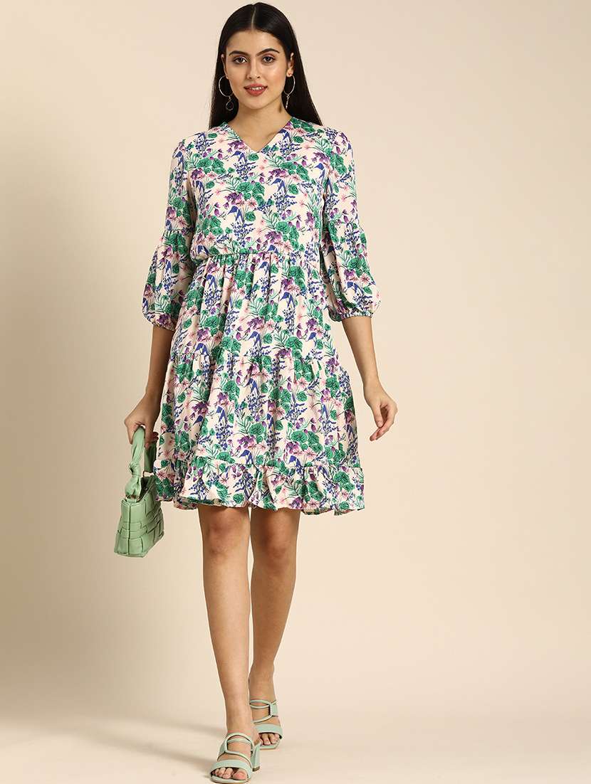 women printed puff sleeves tiered dress