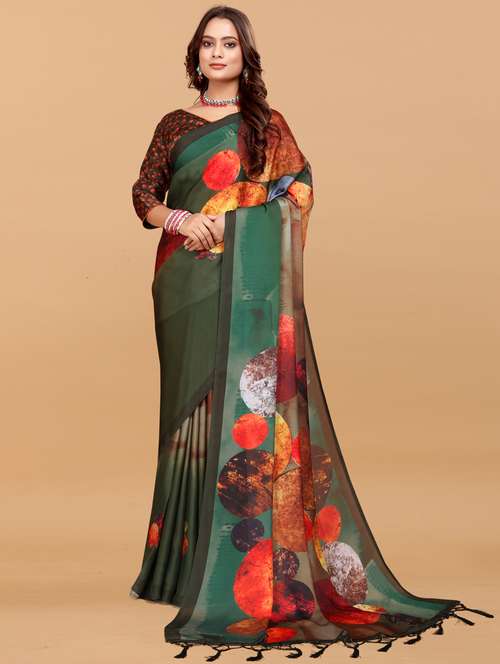 Mehandi Dark Green Satin Georgette Saree with Geometric Print: A bold yet traditional choice, this Dark Green Mehandi Saree combines geometric digital prints with the richness of satin and designer accents. Color: Dark Green Fabric: Satin::Georgette Print: Digital Geometric Add-on: Fancy Latkans Style: Ethnic Bollywood Saree Length: 5.5 Mtr Blouse: 0.8 Mtr Included