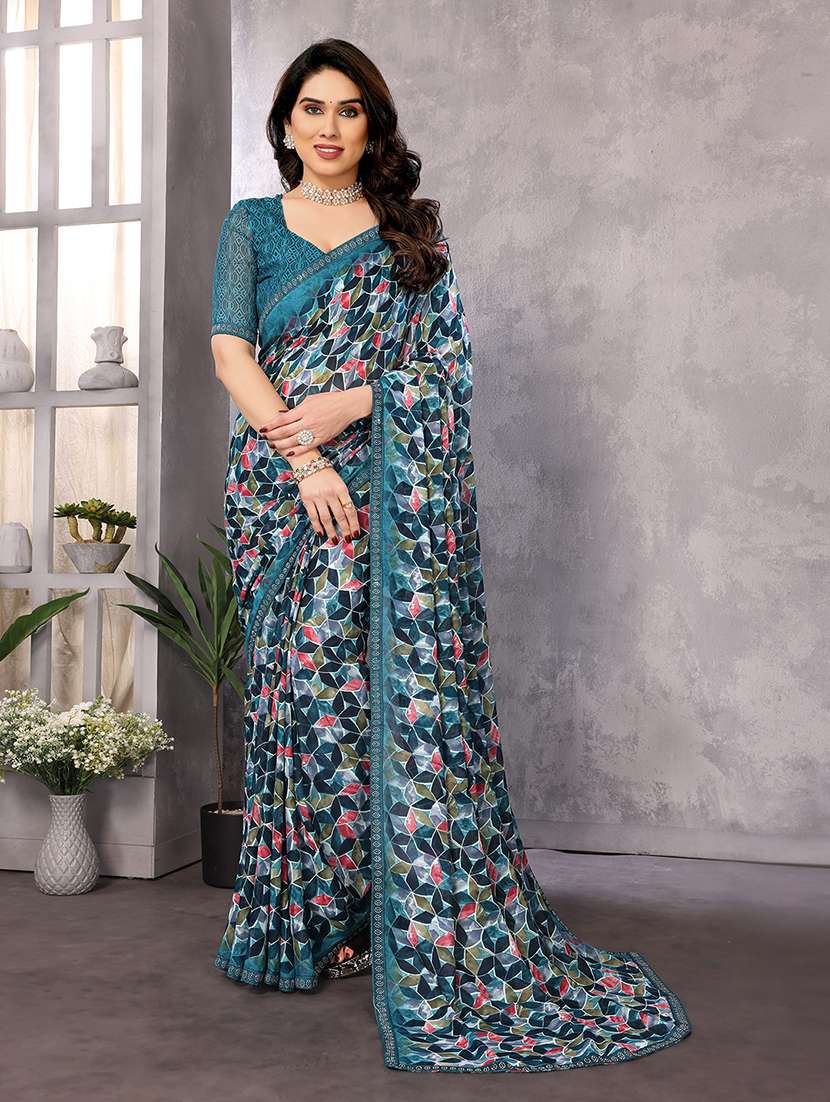This Rama-colored printed georgette saree combines modern prints with classic elegance. Its lightweight fabric ensures all-day comfort, while the lace border adds a refined touch. Whether you're heading to work, a casual gathering, or a day out, this saree offers a stylish and versatile option for any occasion.