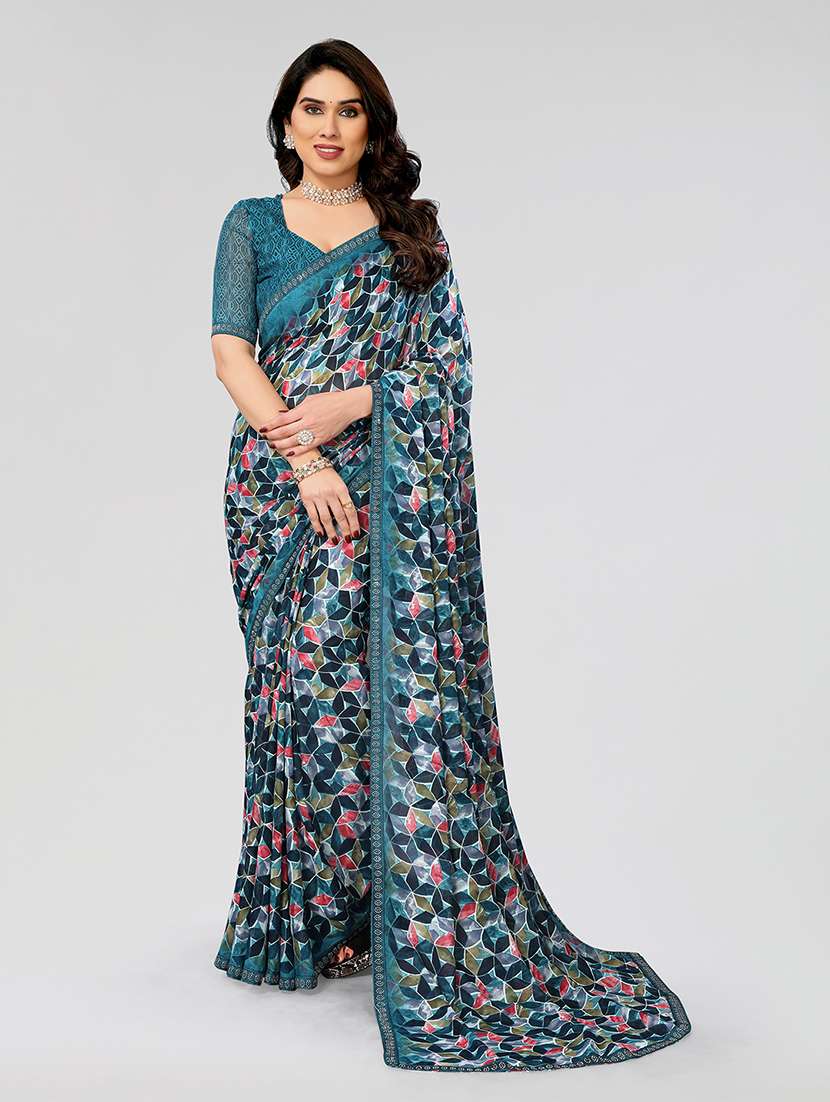 This Rama-colored printed georgette saree combines modern prints with classic elegance. Its lightweight fabric ensures all-day comfort, while the lace border adds a refined touch. Whether you're heading to work, a casual gathering, or a day out, this saree offers a stylish and versatile option for any occasion.