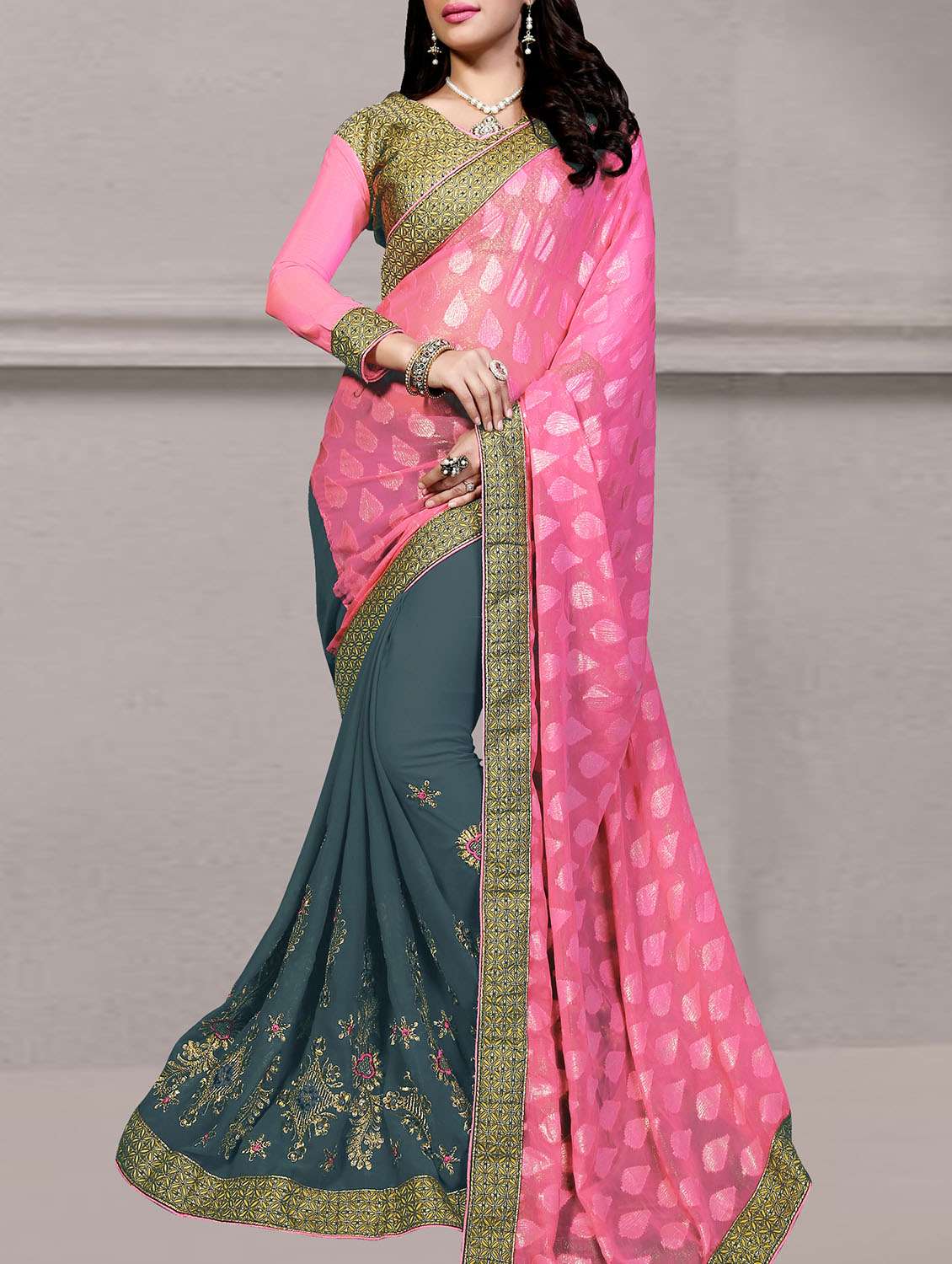 half and half embroidered saree with blouse