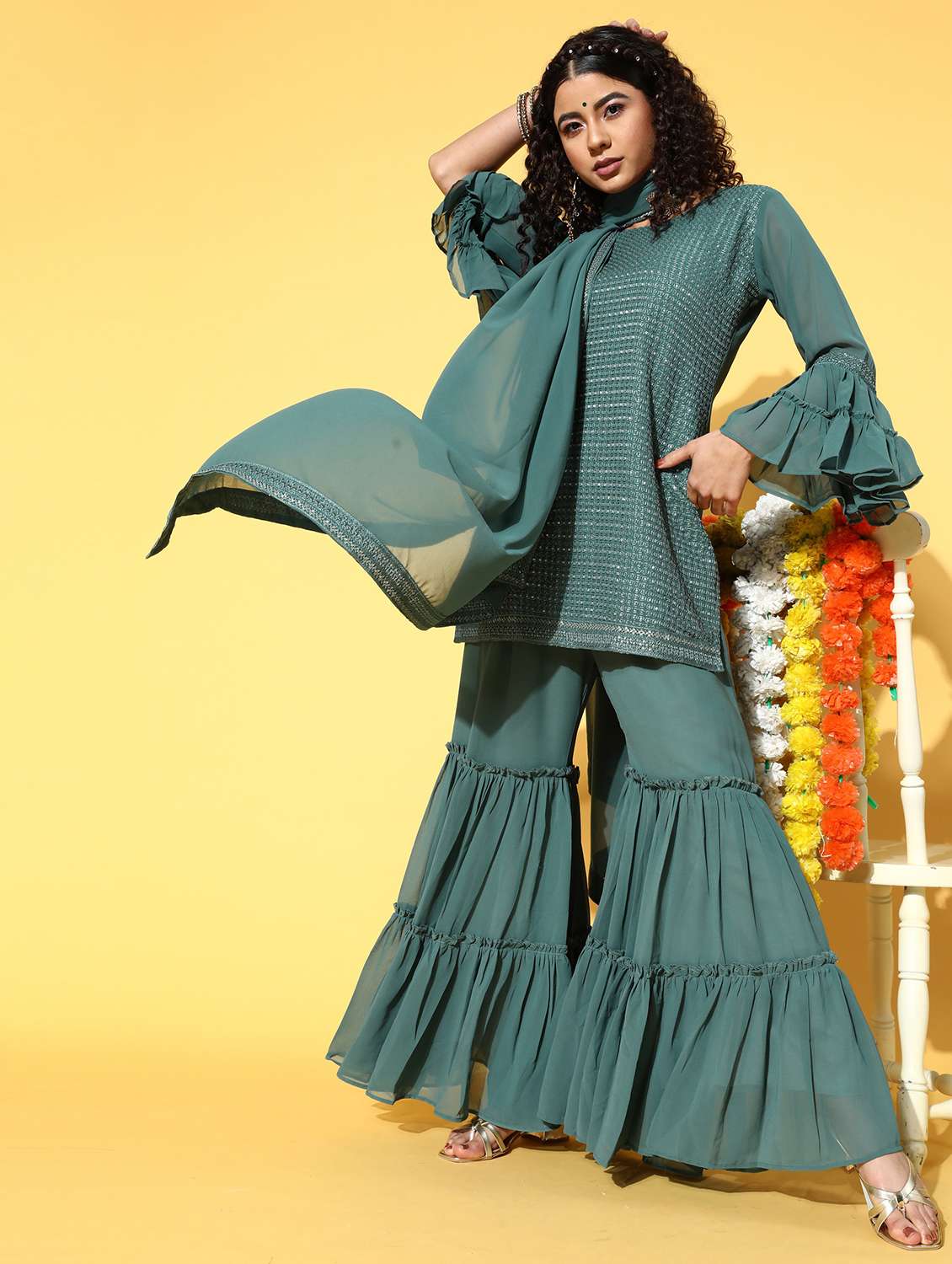 women green kurta sharara set with dupatta
