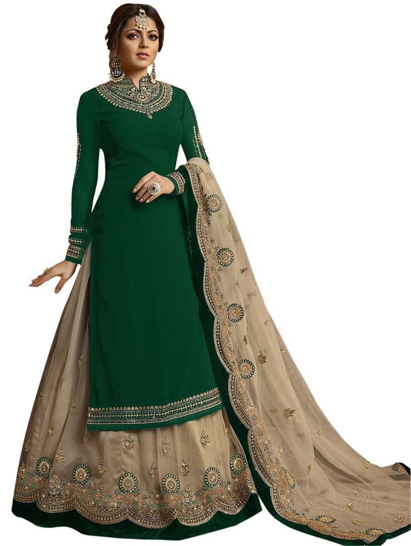 - Find versatile complete set of semi-stitched suits in trending designs in bottle green colors suitable for wedding wear occasions.