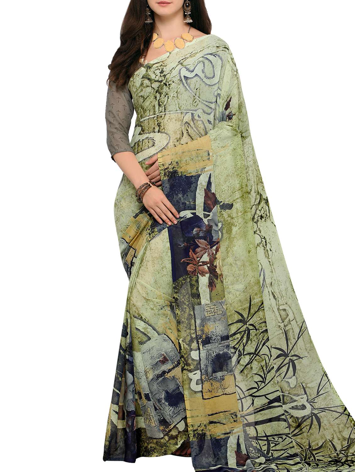 Light weight georgette saree with geometric prints. Blouse attached is also made of georgette; Material Measurements: 5.2 m long & 112 cm wide saree. Blouse length - 80 cm; This casual wear saree is soft, comfortable and drapes perfectly on your body