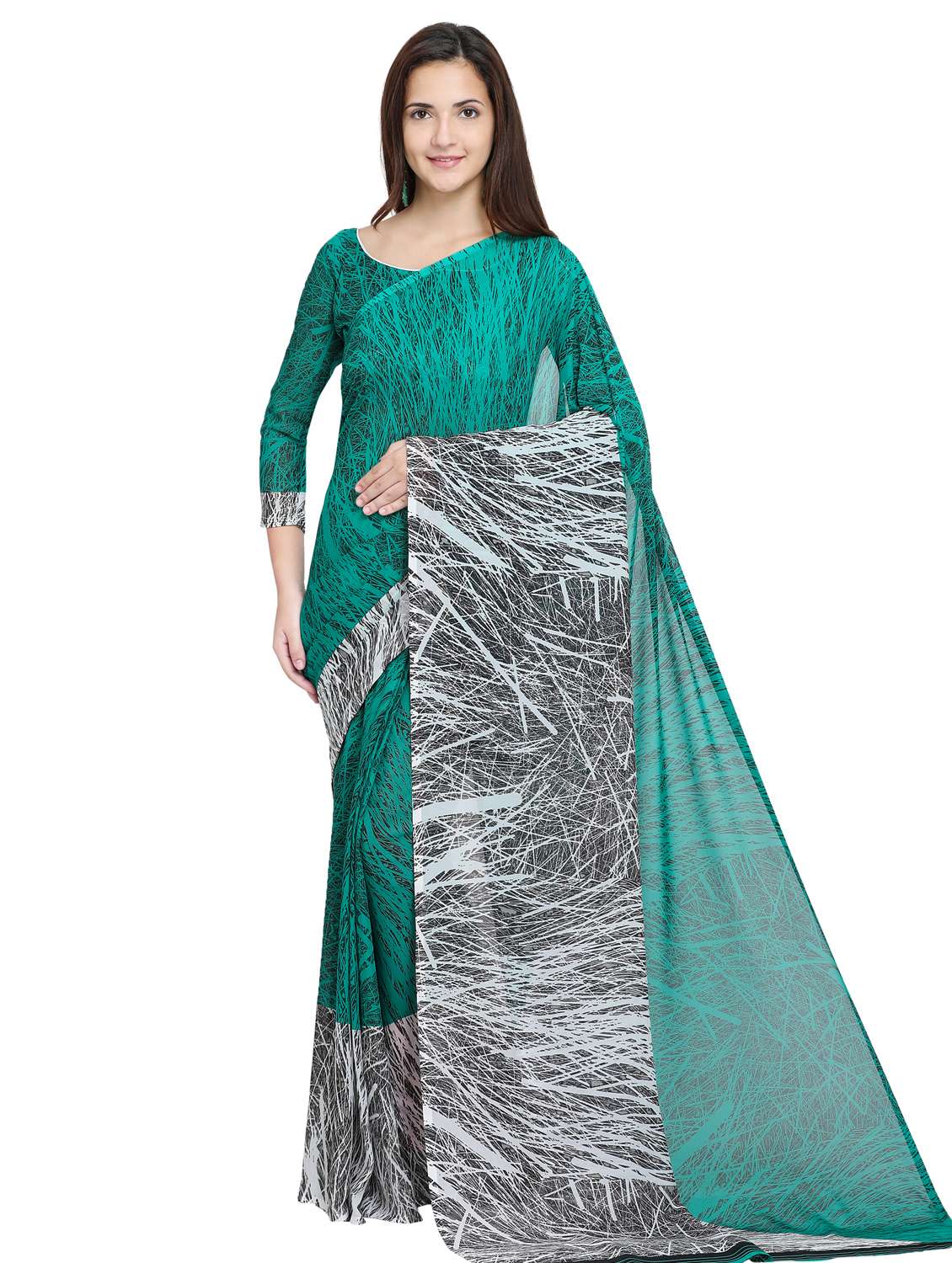 Light weight georgette saree with geometric prints. Blouse attached is also made of georgette; Material Measurements: 5.2 m long & 112 cm wide saree. Blouse length - 80 cm; This casual wear saree is soft, comfortable and drapes perfectly on your body