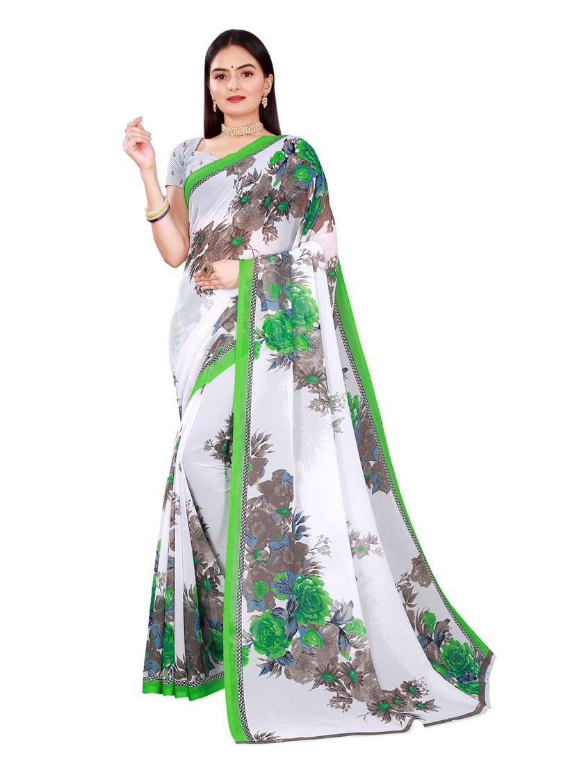 Saadhvi Women's White & Green Georgette Floral Printed Saree With Unstitched Blouse.