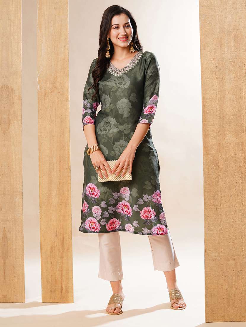- » globus women embroidered v-neck & allover floral printed straight kurta