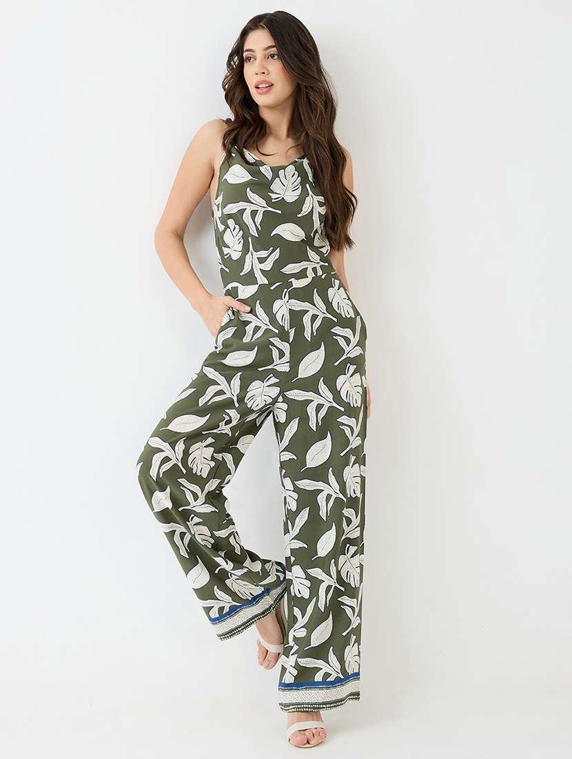 - » women green tropical printed cowl neck shoulder strap longline party jumpsuit