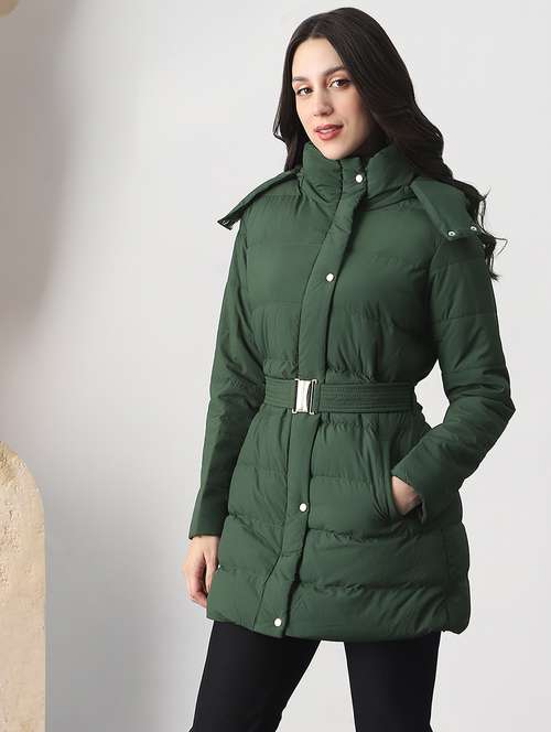 globus women green mock neck long sleeves belted winter wear insulator puffer jacket with detachable hood