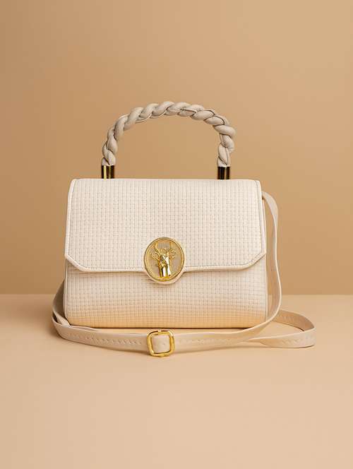 This premium textured sling bag is designed to bring together elegance and functionality in one statement piece. Crafted in a chic swamp green shade with a beautifully woven finish, it features a sturdy braided handle and a signature gold-tone deer emblem that adds a touch of sophistication. The bag is compact yet spacious enough to hold all your essentials, making it perfect for both everyday use and special occasions. With its detachable sling strap, it offers versatile styling options – carry it as a top-handle handbag for a polished look or switch to the sling for hands-free convenience. The neutral yet stylish color makes it an easy match with both western and ethnic outfits, while the premium finish gives it a luxe appeal.