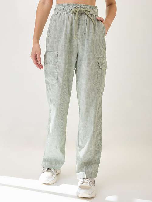 - » globus women light green self design checkered drawstring waist cargo trousers