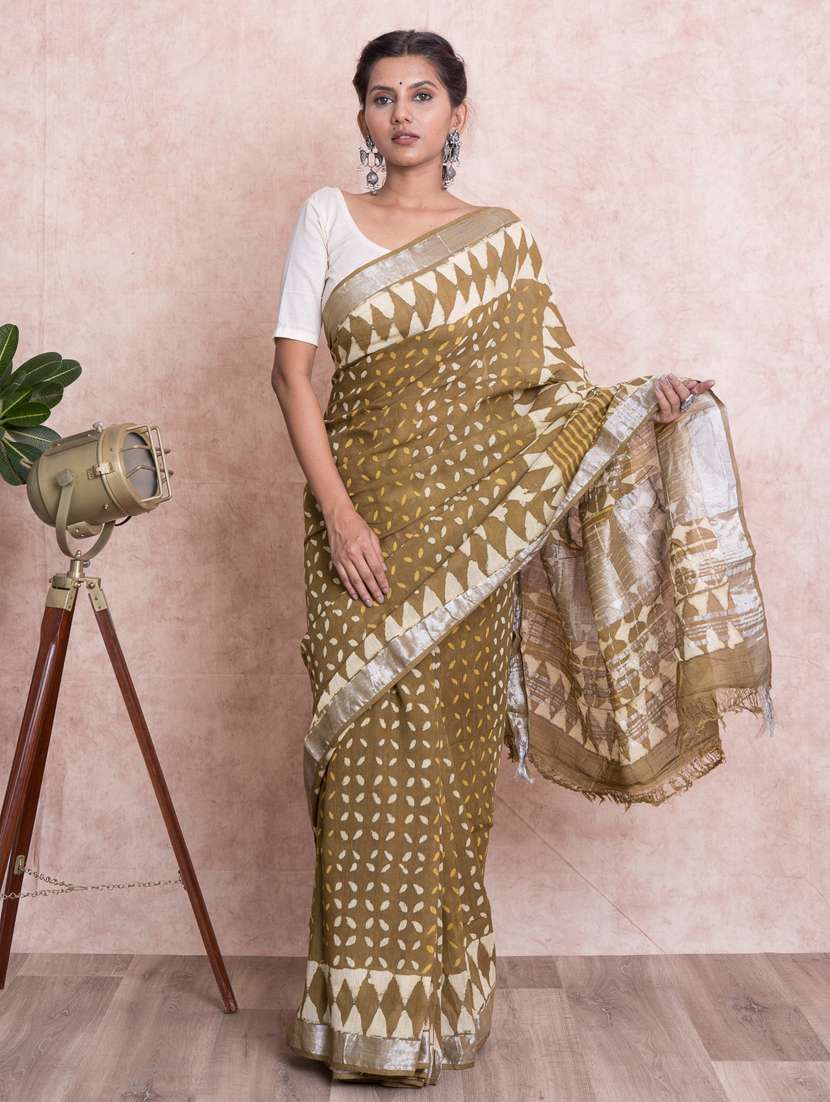 An amazing range of womens ethnic wear in soft and solid colors that looks perfect for regular wear. With beautiful designs and patterns. These apparels are very stylish and comfortable too. Get rid of the regular look this season wearing these Sarees by KISHORI. This mustard dabu print geometric pattern saree from KISHORI exhibits 5.5 mtrs saree and 1 mtr blouse fabric. Tailored from Cotton Linen.