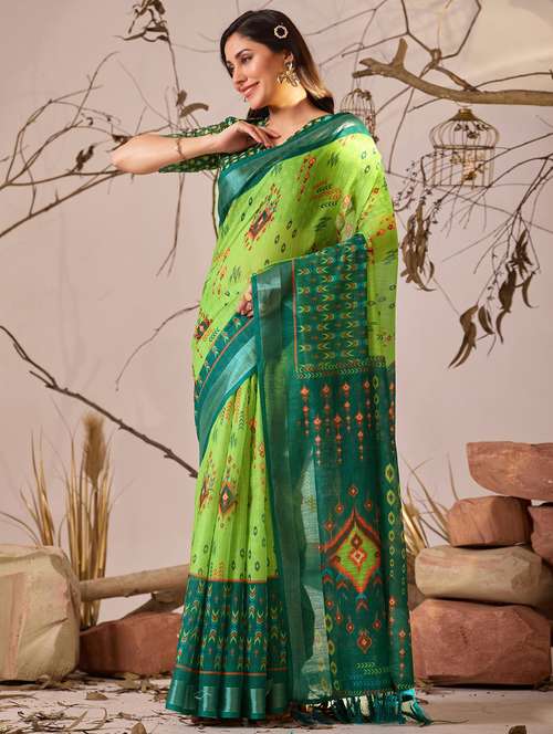 A premium handwoven linen saree with artistic ethnic detailing and vibrant pallu motifs—designed to offer comfort and a standout traditional appeal.