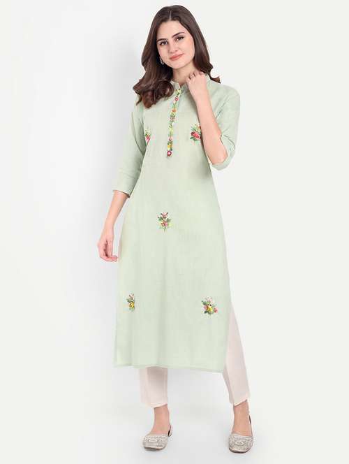 - Grab this beautiful kurta made up of linen fabric featuring mandarin collar neck designs.