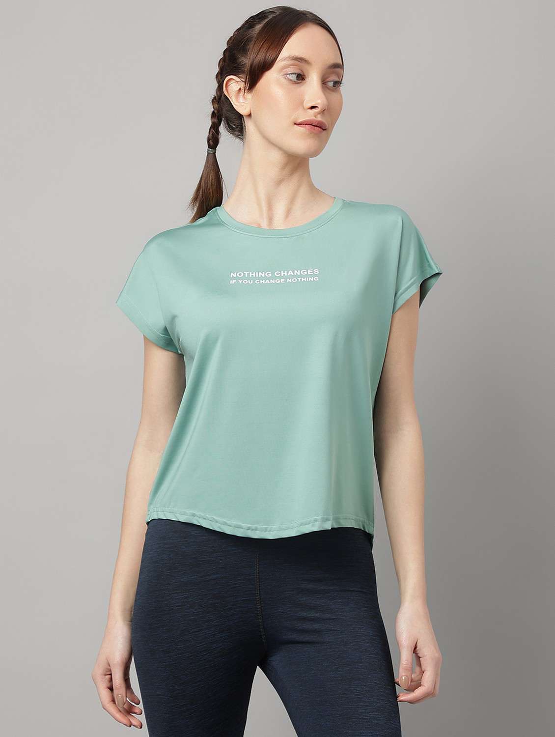 - » women green typographic round neck t-shirt