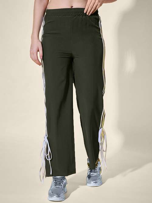 Stay active and stylish in these red women track pants made from durable polyester fabric, featuring classic white side stripes, a comfortable elastic waistband, and unique adjustable ankle tie details. Perfect for workouts or casual days, these pants offer a relaxed fit and sporty appeal for a trendy athleisure look. The model (height 5'7) is wearing a size 30 Waist.