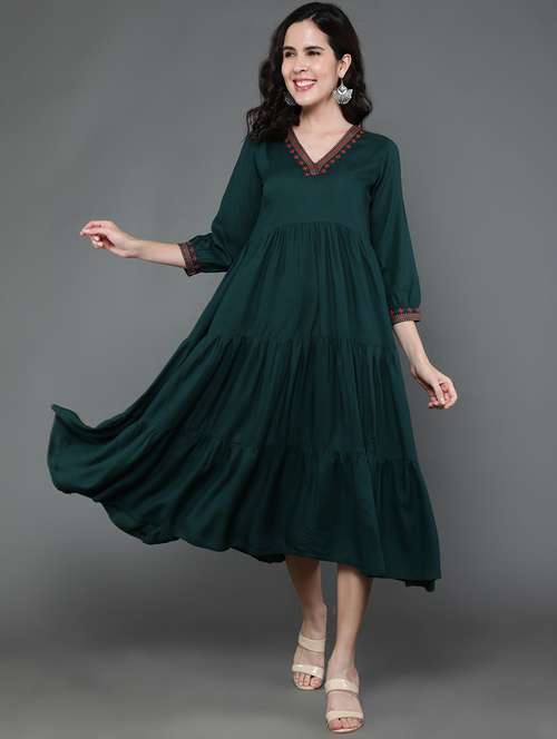 women green v neck tiered dress