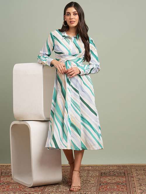 - » globus women green collared neck cuffed sleeves abstract print criss cross tie-up detail midi shirt dress