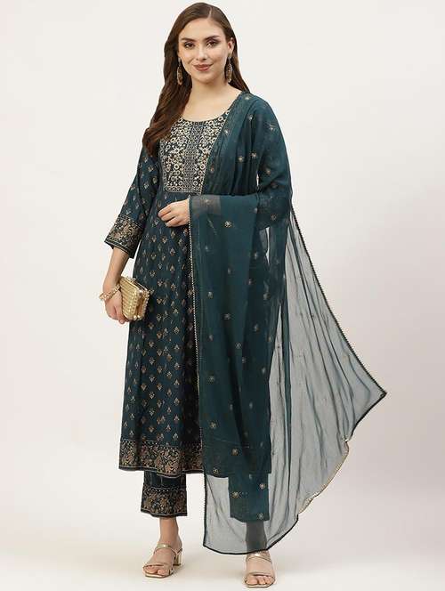 - Find gorgeous sets of ethnic wears in trending designs in teal colors suitable for festive wear of occasions.