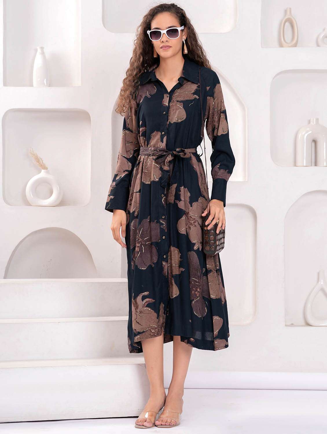 women floral print long sleeve collared shirt dress