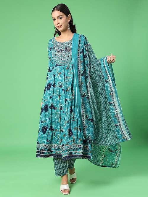 - Find gorgeous sets of ethnic wears in trending designs in teal colors suitable for casual wear of occasions.