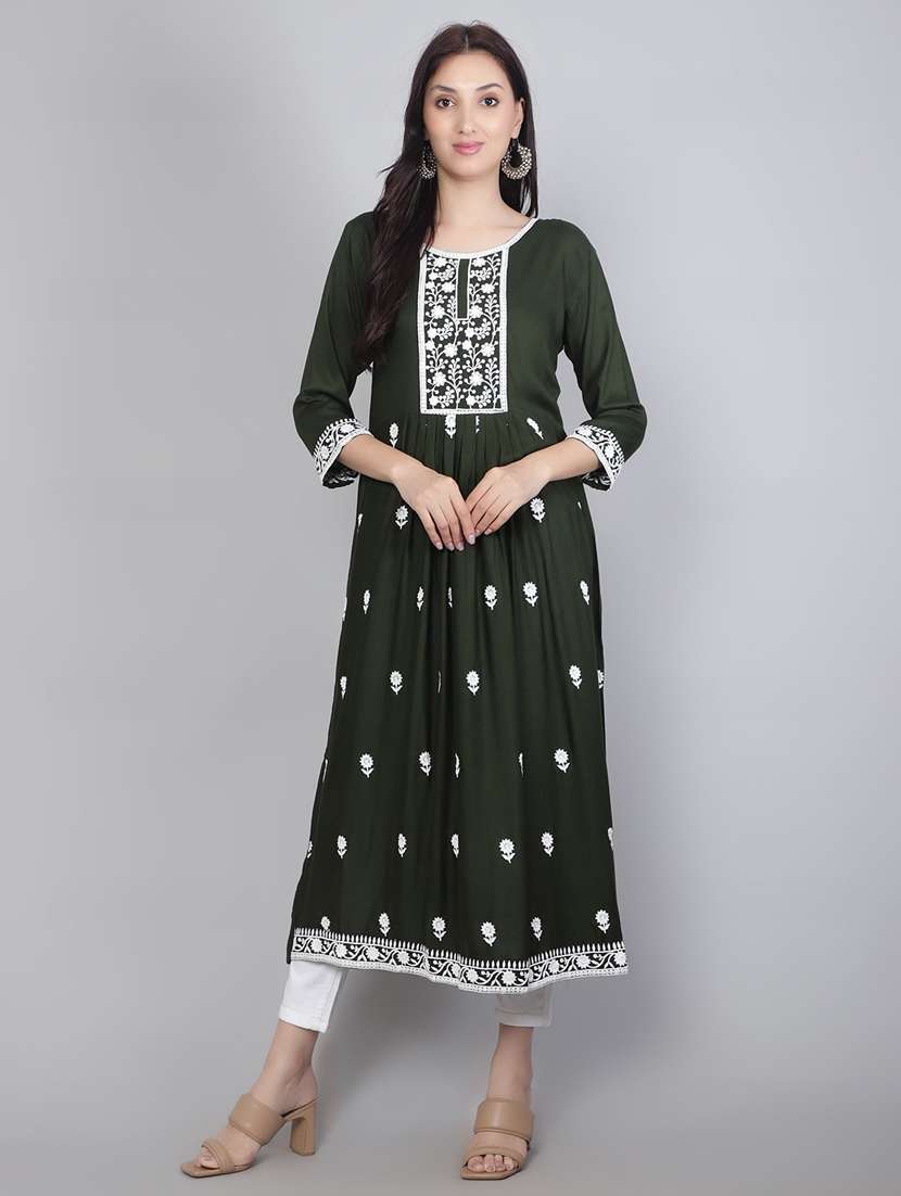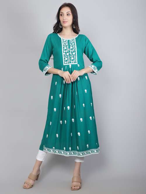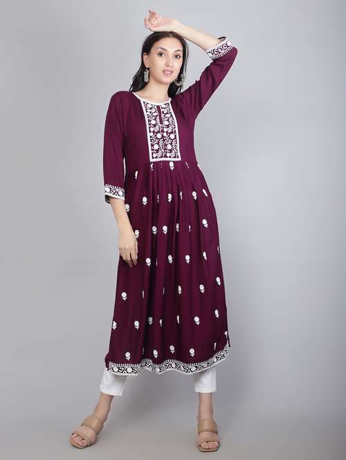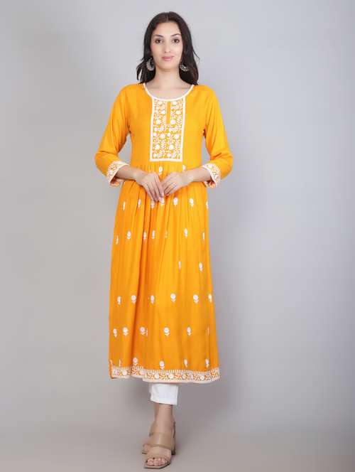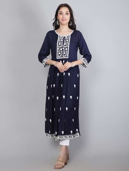 - Grab this beautiful kurta made up of rayon fabric featuring round neck designs.