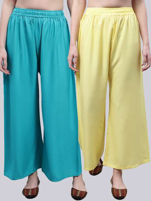 Upgrade your collection of warm-weather staples with these top-notch Light Yellow and Turquoise Blue palazzo combo by Valles365. Pair them with a flowy tee and lace-up sandals for a super chic look.