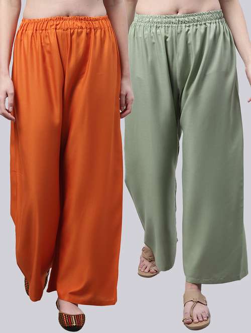 Upgrade your collection of warm-weather staples with these top-notch Rust Orange and Pista Green palazzo combo by Valles365. Pair them with a flowy tee and lace-up sandals for a super chic look.