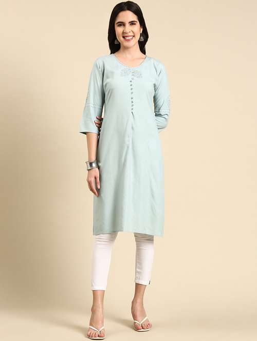 - Grab this beautiful kurta made up of polyester fabric featuring round neck designs.