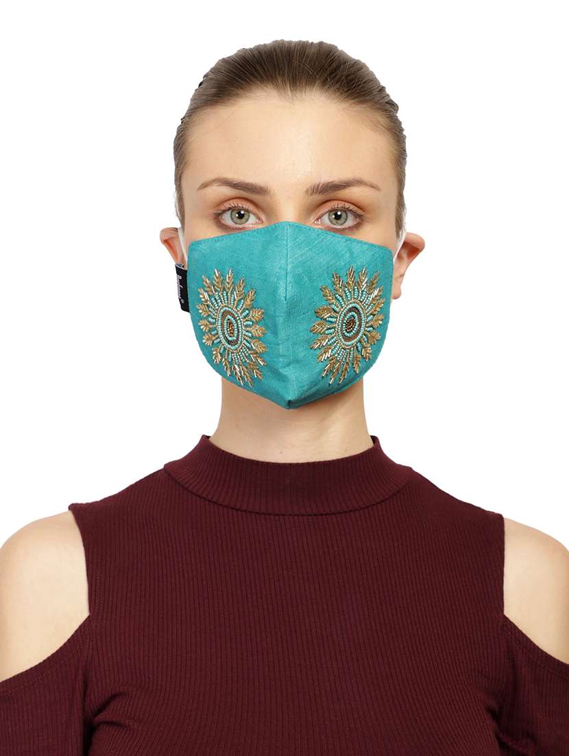 3-ply turquoise & gold art silk embellished fabric fashion mask